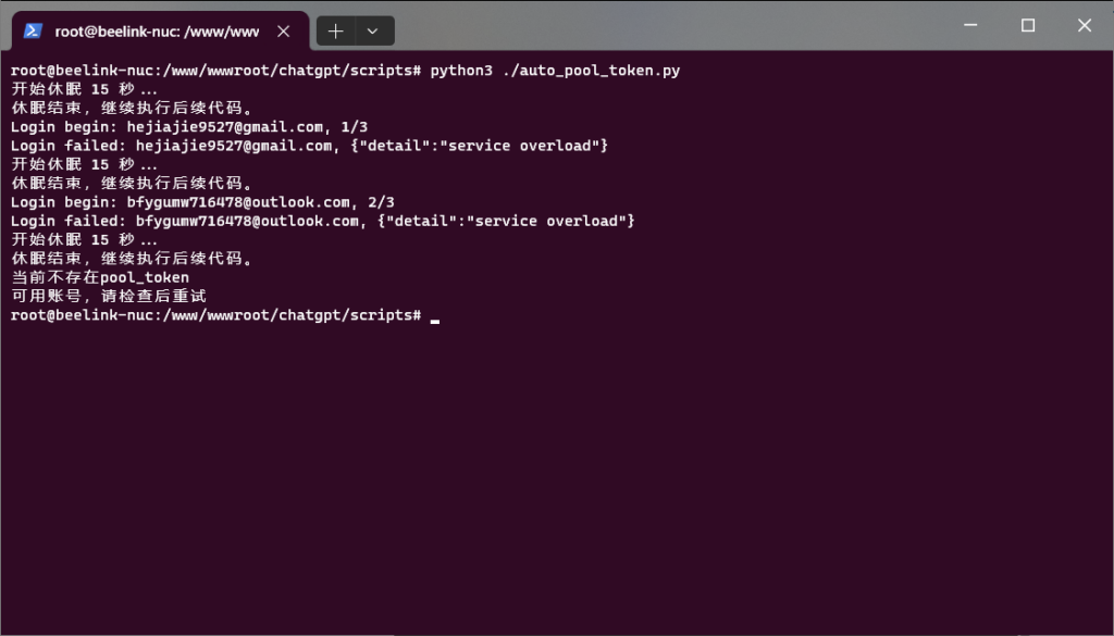 本来后台用 mufeng510/Free-ChatGPT-API: 基于pandora的ChatGPT API,实现了pool token的自动更新 (github.com)的Python脚本好好的,直到…